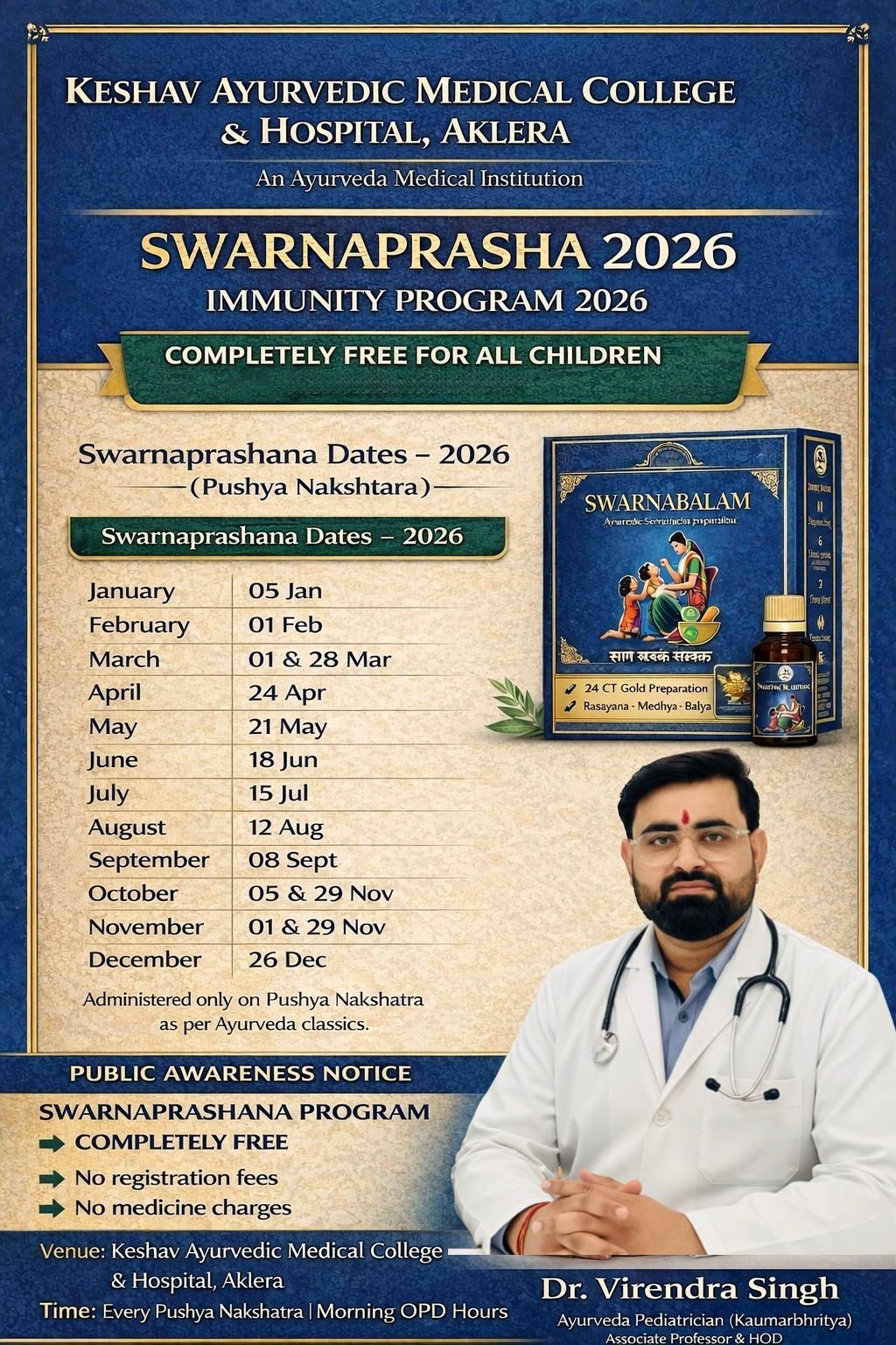 03 Marजन्म से 16 साल तक के सभी बच्चो को पुष्य नक्षत्र के दिन निःशुल्क स्वर्णप्राशन पिलाया जायगा।