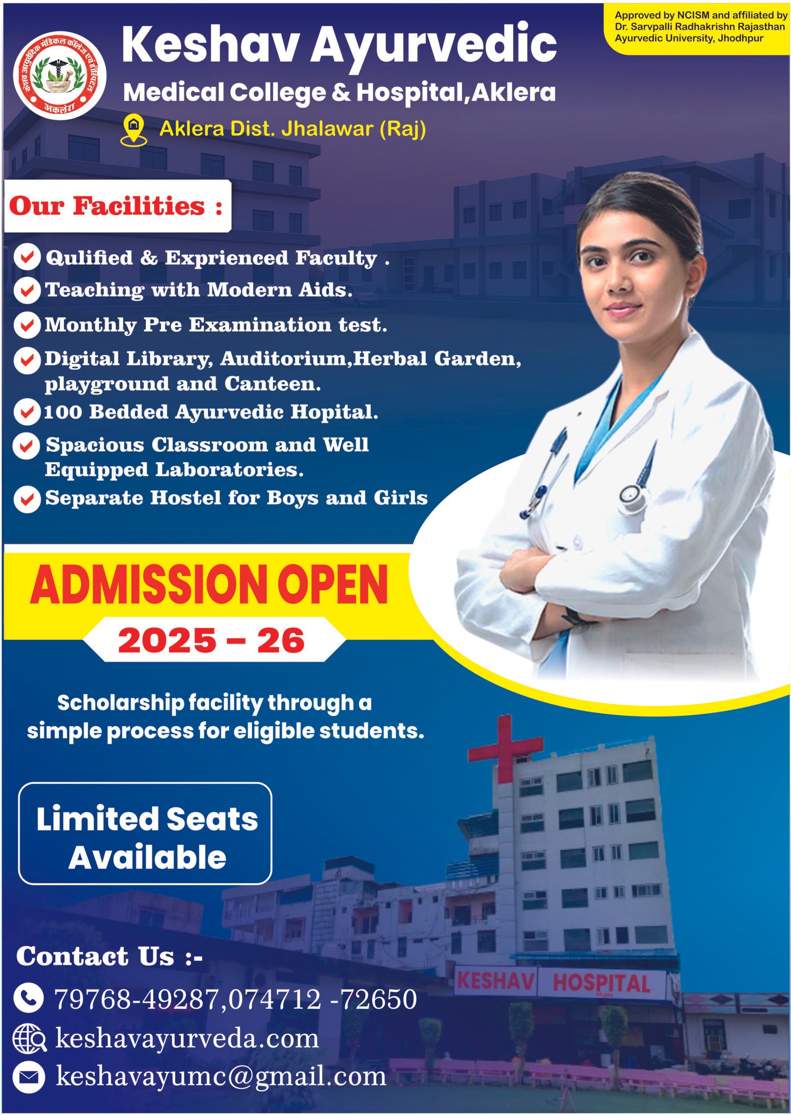 Our aim is to restore the ancient system of medicine means Ayurveda in the present system of health and to make it a recognized and distinguished path in society. Keshav Ayurvedic Medical College and Hospital would fill this gap and will be instrumental in attracting foreign patients for Ayurvedic treatment of such chronic health problems, which do not find solutions in other medical systems. The Institute is expected to help boost medical tourism in the Hadoti region of Rajasthan and showcasing strengths of Ayurved.